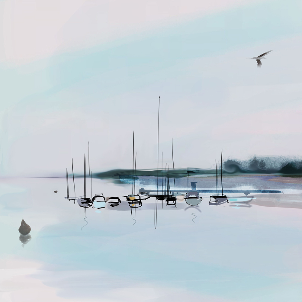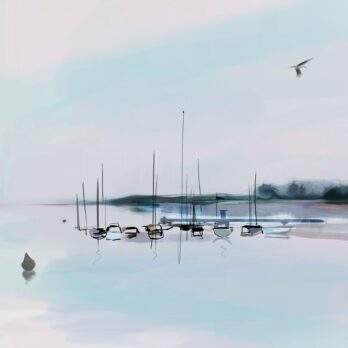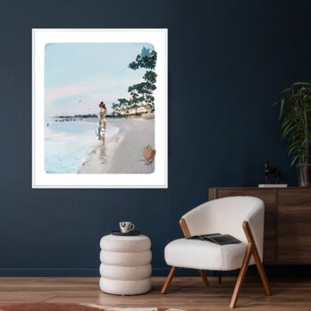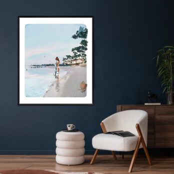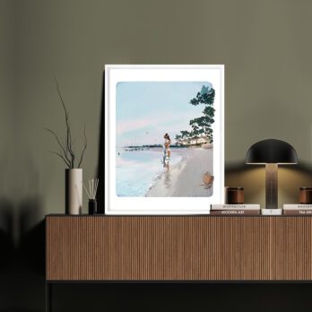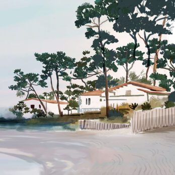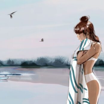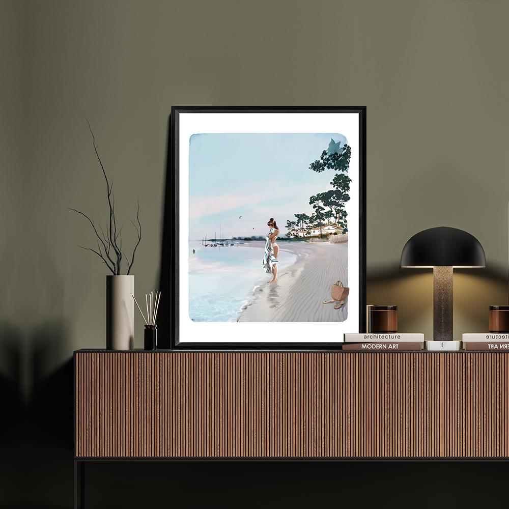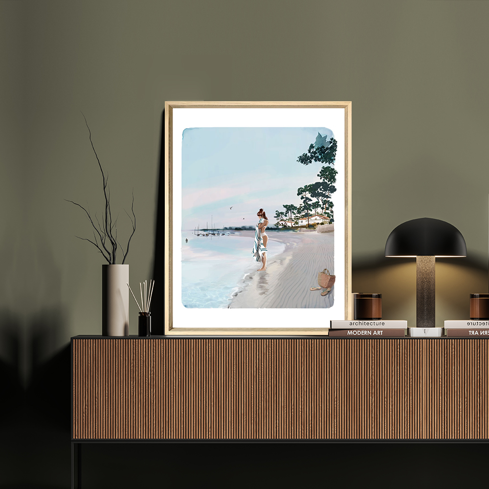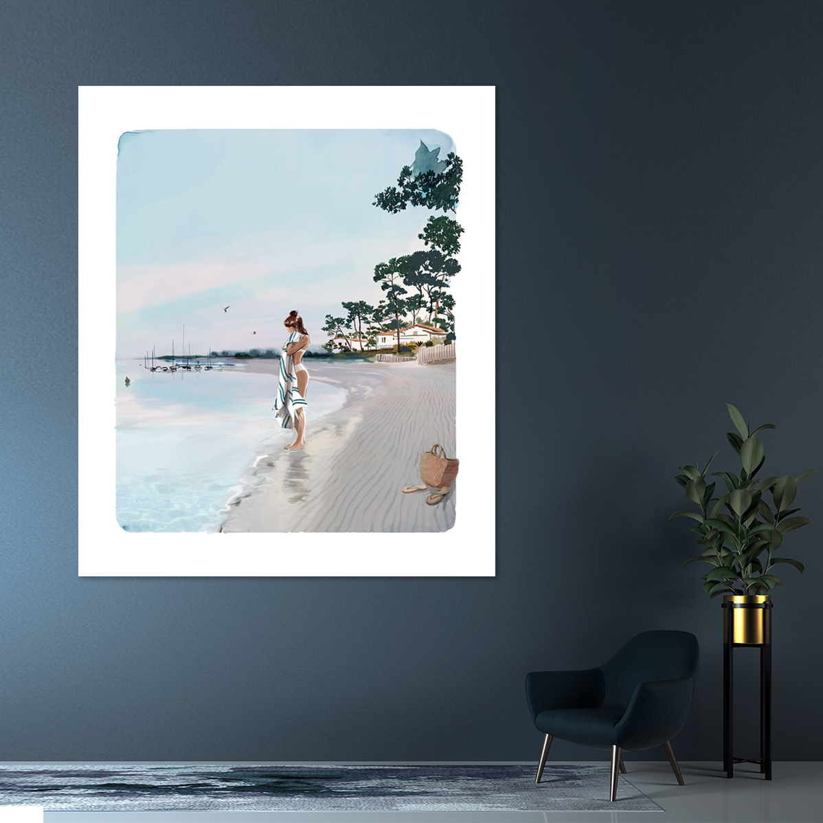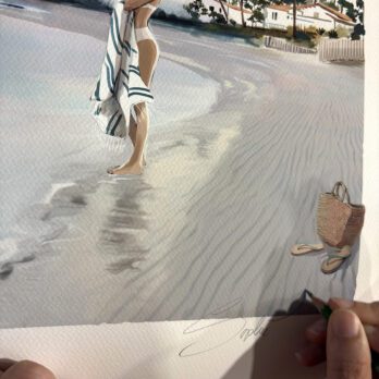Sophie Griotto illustre une jeune femme sortant de la mer sur une plage du sud-ouest, s’essuyant le cou avec une grande serviette. Une œuvre délicate et lumineuse où se mêlent mode, féminité et esprit balnéaire.