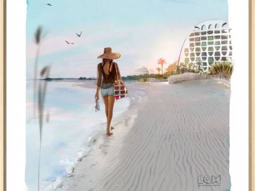 Cette œuvre capture une promenade paisible sur la Jetée Thiers à Arcachon, baignée d’une lumière douce d’aube ou de crépuscule. Une femme élégante avance avec un sac jaune éclatant, tandis que les bancs, lampadaires et bateaux amarrés composent une scène sereine. Entre ciel pastel et atmosphère poétique, le tableau illustre l’harmonie entre l’homme et la nature, tout en mettant en lumière le charme unique de cette jetée emblématique du bassin d’Arcachon.