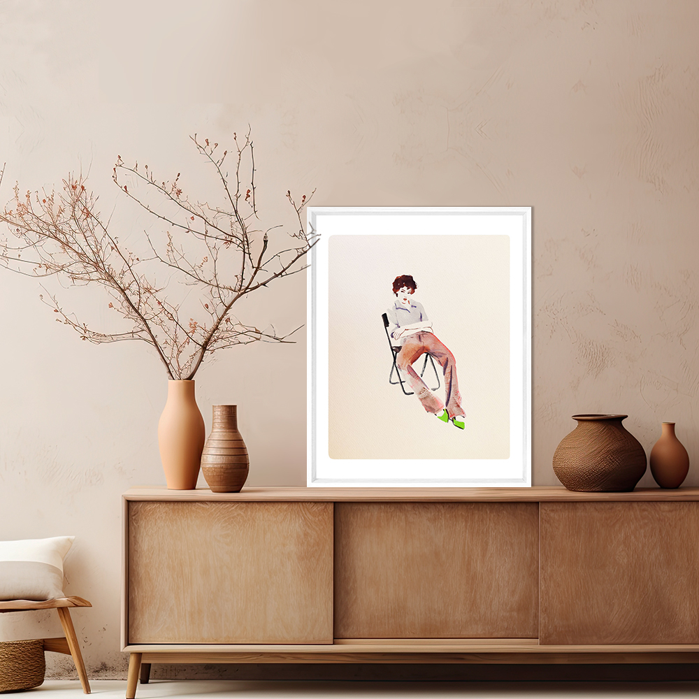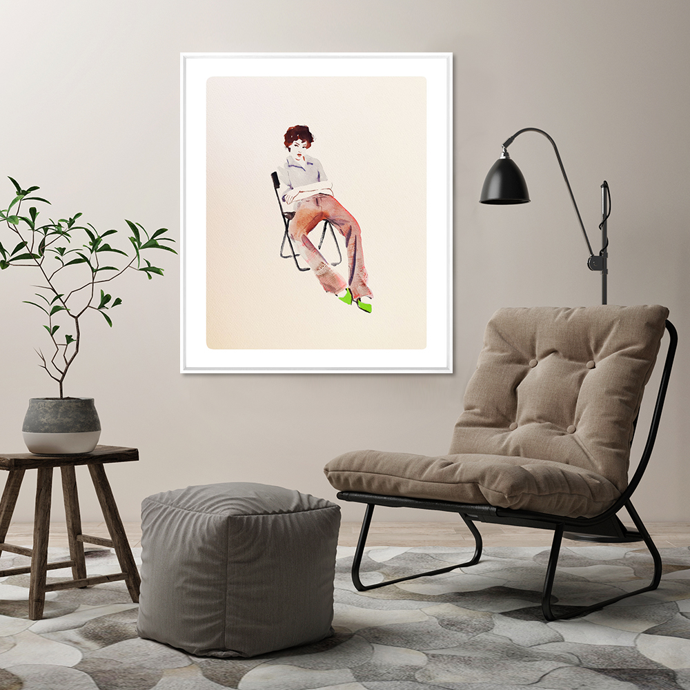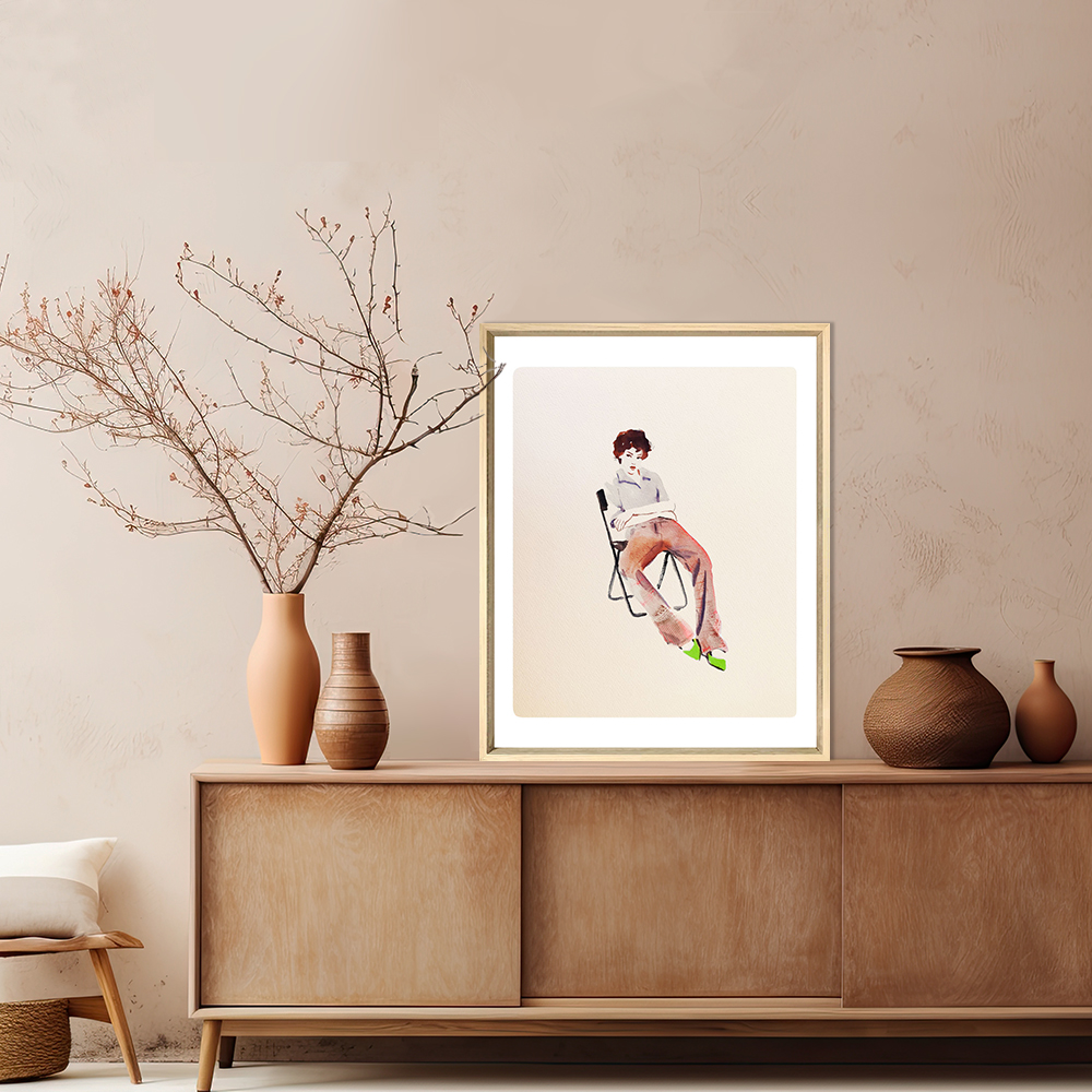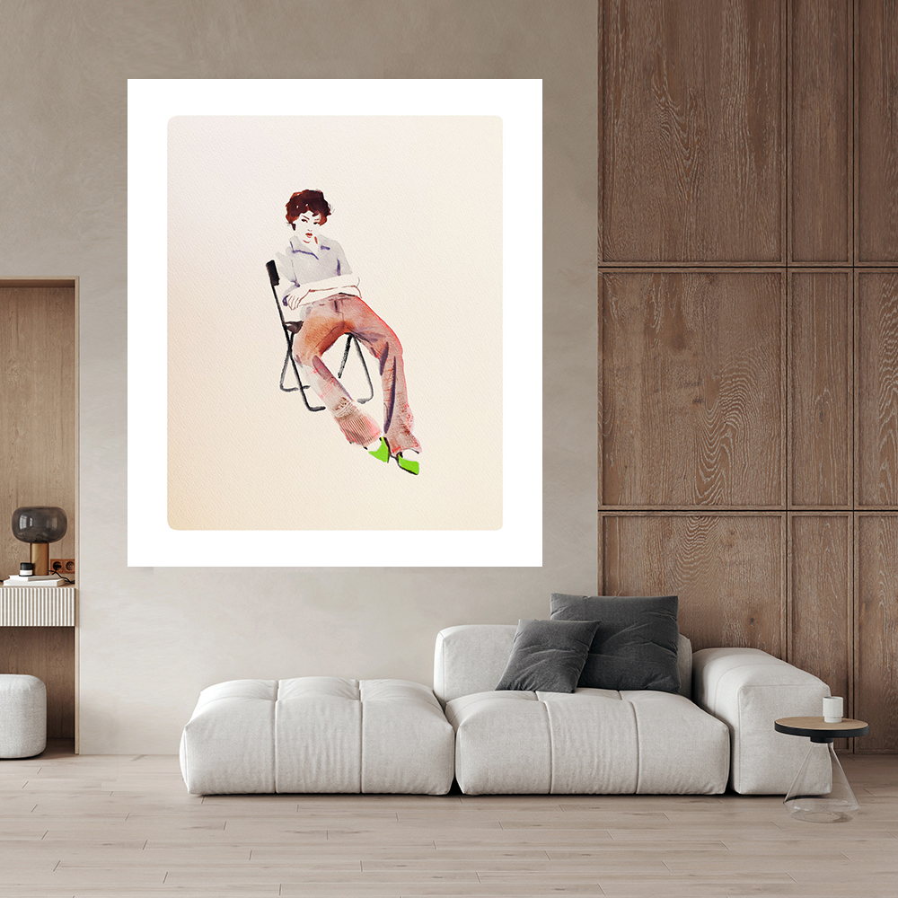 Dans La Désinvolture, Sophie Griotto capture l’attitude élégante et décontractée d’une jeune femme bouclée assise sur une chaise, vêtue d’escarpins vert fluo, d’un jean rose à motifs ethniques et d’un polo gris. Une œuvre moderne où mode et personnalité se rencontrent avec style.
