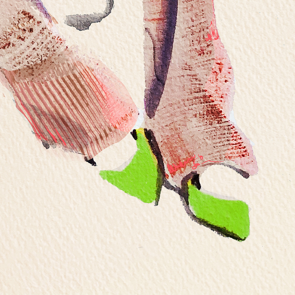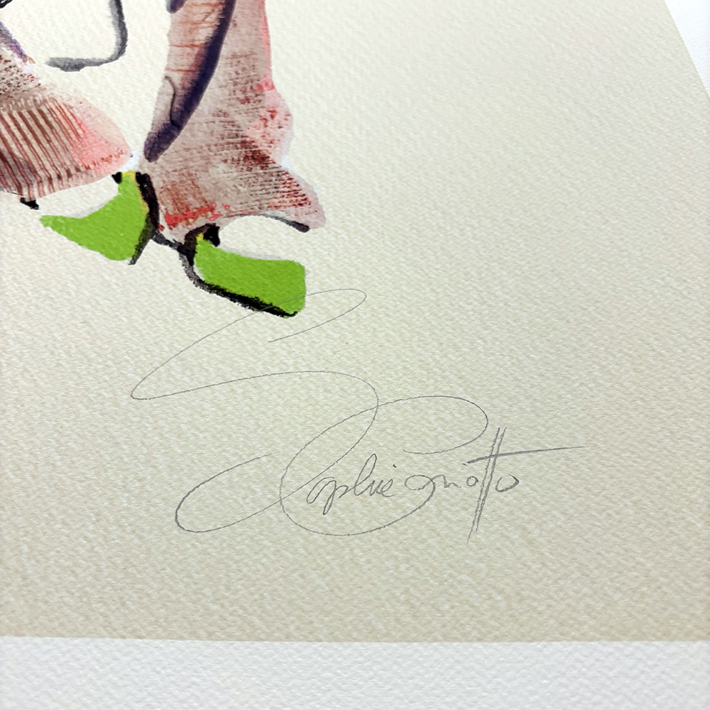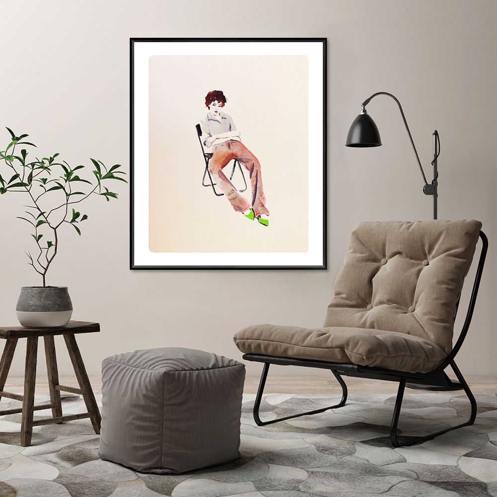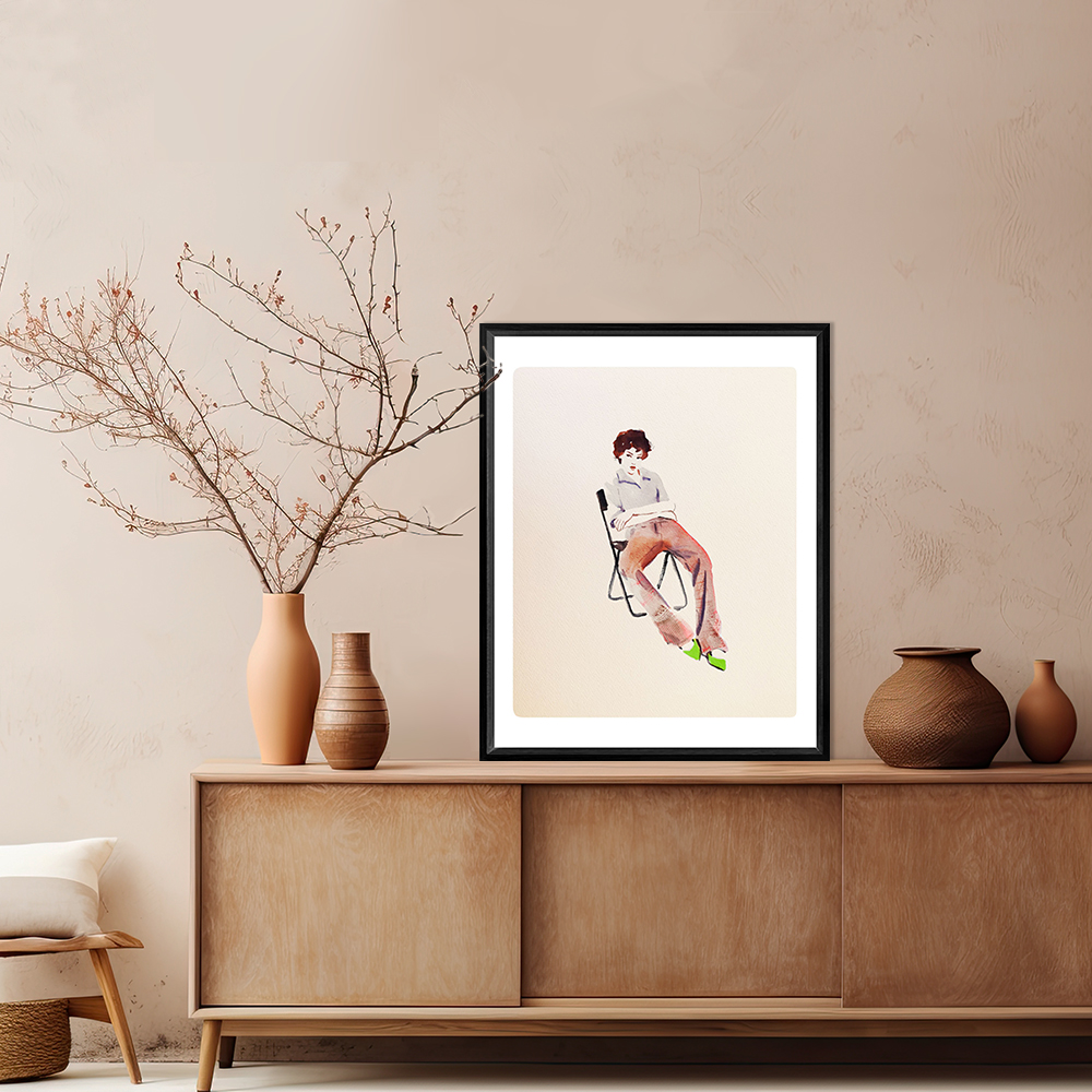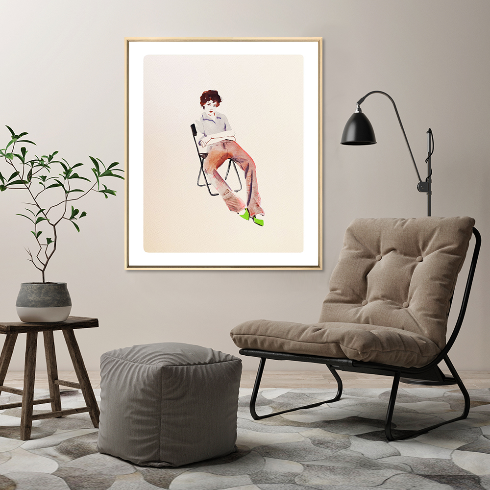 Dans La Désinvolture, Sophie Griotto capture l’attitude élégante et décontractée d’une jeune femme bouclée assise sur une chaise, vêtue d’escarpins vert fluo, d’un jean rose à motifs ethniques et d’un polo gris. Une œuvre moderne où mode et personnalité se rencontrent avec style.