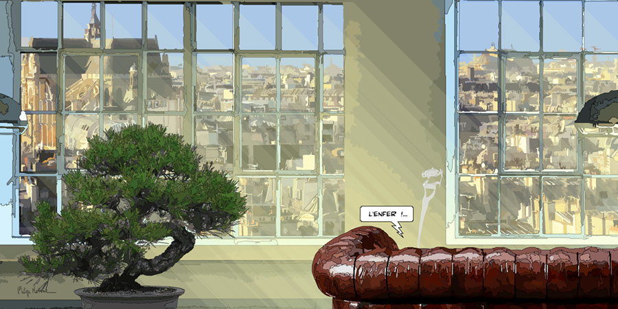 Ses œuvres, souvent inspirées par ses voyages et son environnement urbain, captivent par leur capacité à raconter en une seule image. Elles sont construites autour d’un concept simple : dans tout paysage se cachent des histoires et celles-ci ne demandent qu’à accrocher, intriguer le spectateur. Avec un traitement graphique rappelant la ligne claire et une énergie vibrante, chaque scène invite le spectateur à s’immerger dans un univers narratif unique et un style définitivement contemporain. Que ce soit une bulle échappant d’une fenêtre ou des personnages intrigants dans un paysage urbain, chaque détail invite à l’imagination. Intrigante ou drôle, inquiétante, loufoque ou romantique cette histoire appartient à chacun.