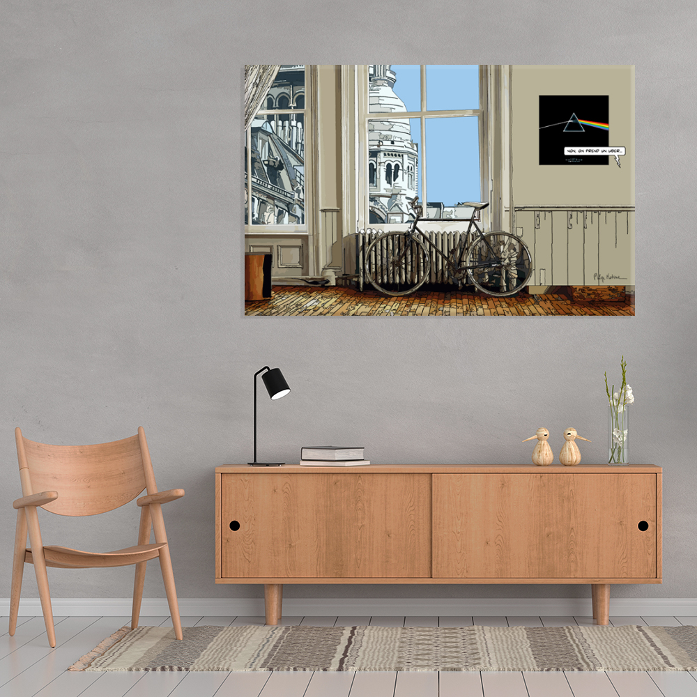 Ses œuvres, souvent inspirées par ses voyages et son environnement urbain, captivent par leur capacité à raconter en une seule image. Elles sont construites autour d’un concept simple : dans tout paysage se cachent des histoires et celles-ci ne demandent qu’à accrocher, intriguer le spectateur. Avec un traitement graphique rappelant la ligne claire et une énergie vibrante, chaque scène invite le spectateur à s’immerger dans un univers narratif unique et un style définitivement contemporain. Que ce soit une bulle échappant d’une fenêtre ou des personnages intrigants dans un paysage urbain, chaque détail invite à l’imagination. Intrigante ou drôle, inquiétante, loufoque ou romantique cette histoire appartient à chacun.