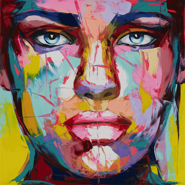 Sa signature artistique, des visages en plan rapproché, sont réalisés en peinture contemporaine à l’huile et au couteau, tout en couleurs. La peinture est devenue la colonne vertébrale de cette ancienne illustratrice française, ce qui la fait vivre, la tient debout. À sa manière, elle refait le visage humain dans chacun de ses tableaux d’art contemporain, à coups de boutoir, à coups de couteau, balafres sur le visage. Les éclats de vie surgissent de sa peinture. La couleur est lancée comme un projectile par l’artiste contemporaine française. La peinture fluorescente, élément fondamental de ses créations depuis l’origine, apporte une double lecture de l’œuvre d’art originale suivant son éclairage naturel ou ultraviolet.