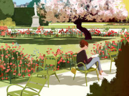 Ses œuvres, souvent inspirées par ses voyages et son environnement urbain, captivent par leur capacité à raconter en une seule image. Elles sont construites autour d’un concept simple : dans tout paysage se cachent des histoires et celles-ci ne demandent qu’à accrocher, intriguer le spectateur. Avec un traitement graphique rappelant la ligne claire et une énergie vibrante, chaque scène invite le spectateur à s’immerger dans un univers narratif unique et un style définitivement contemporain. Que ce soit une bulle échappant d’une fenêtre ou des personnages intrigants dans un paysage urbain, chaque détail invite à l’imagination. Intrigante ou drôle, inquiétante, loufoque ou romantique cette histoire appartient à chacun.