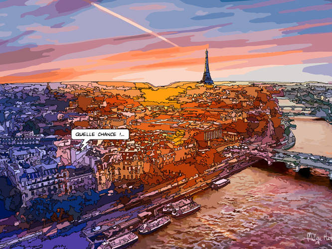 Ses œuvres, souvent inspirées par ses voyages et son environnement urbain, captivent par leur capacité à raconter en une seule image. Elles sont construites autour d’un concept simple : dans tout paysage se cachent des histoires et celles-ci ne demandent qu’à accrocher, intriguer le spectateur. Avec un traitement graphique rappelant la ligne claire et une énergie vibrante, chaque scène invite le spectateur à s’immerger dans un univers narratif unique et un style définitivement contemporain. Que ce soit une bulle échappant d’une fenêtre ou des personnages intrigants dans un paysage urbain, chaque détail invite à l’imagination. Intrigante ou drôle, inquiétante, loufoque ou romantique cette histoire appartient à chacun.
