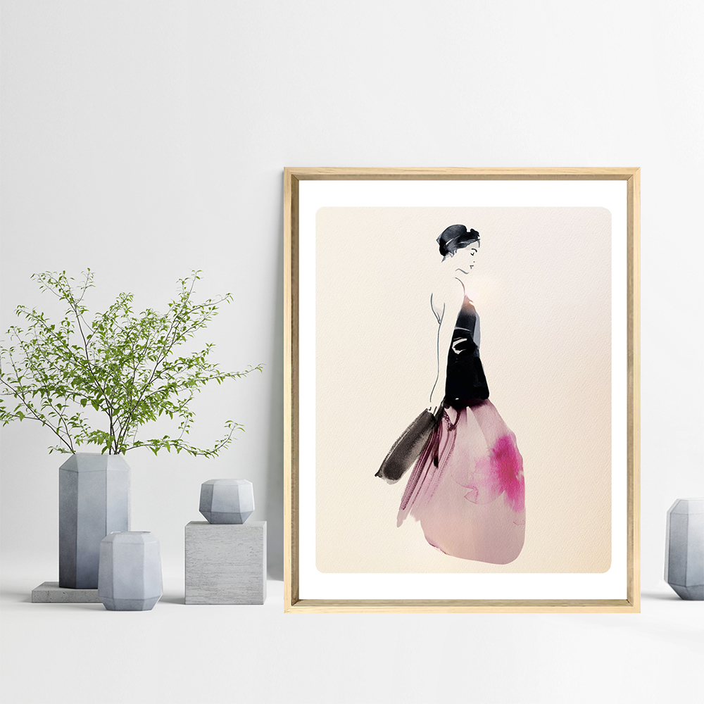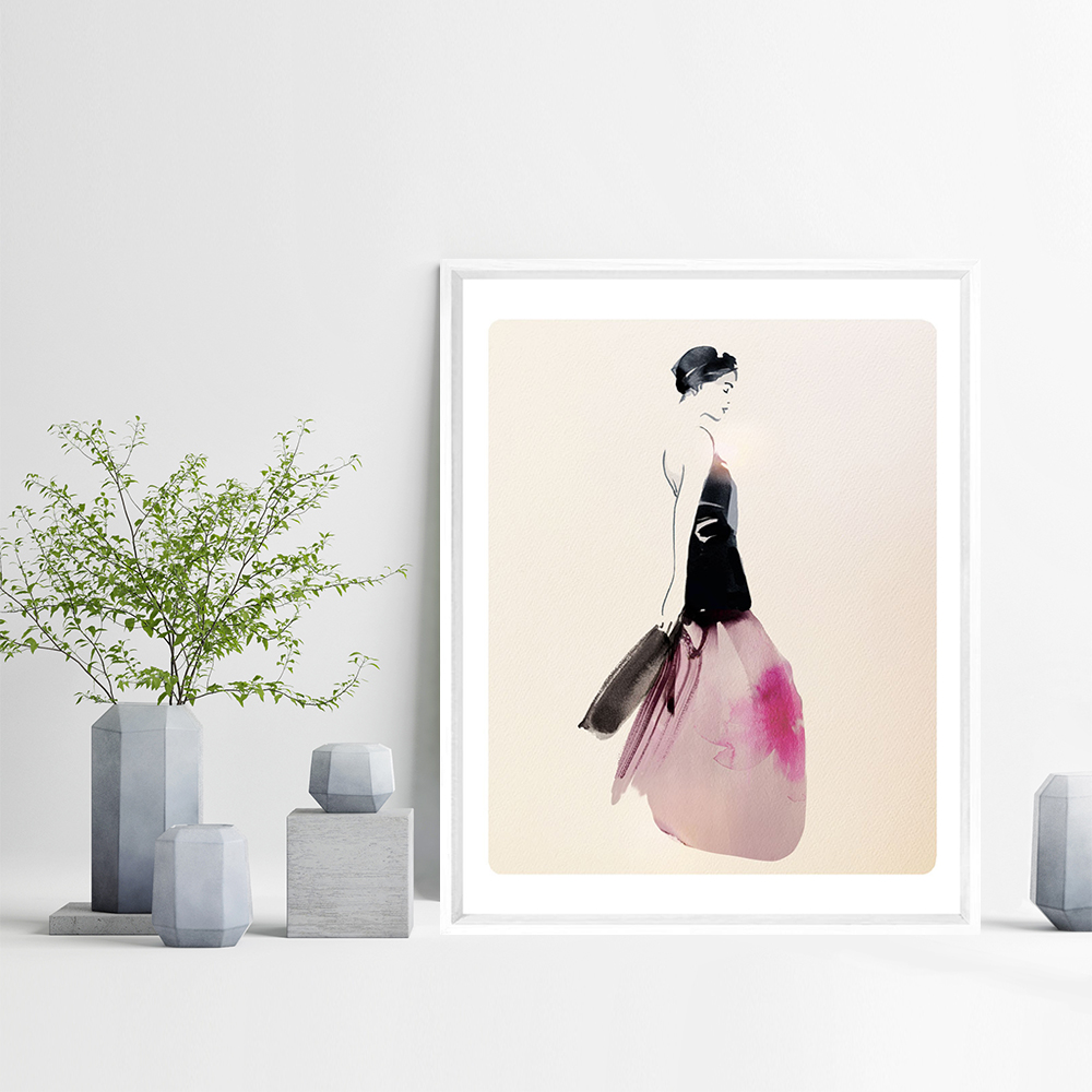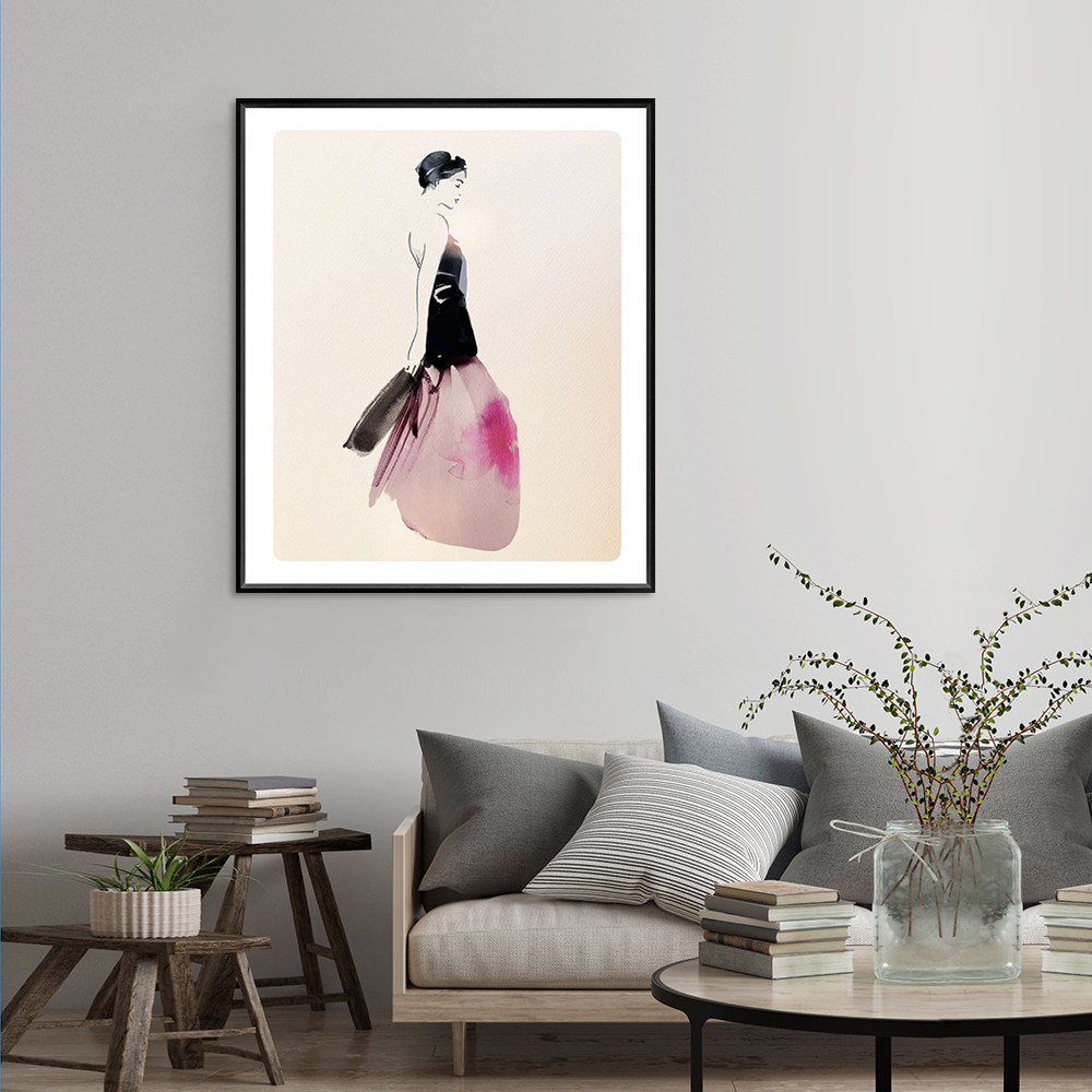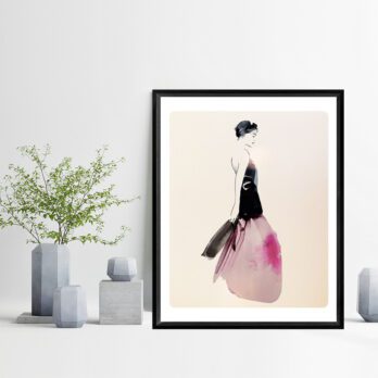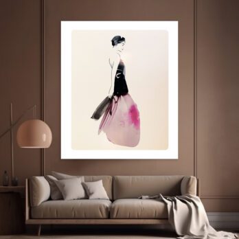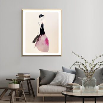Cette œuvre de Sophie Griotto illustre une femme en robe vaporeuse, mêlant contraste noir et rose aquarellé dans un style minimaliste. Une composition élégante et contemporaine qui capte à la fois mouvement et sérénité.