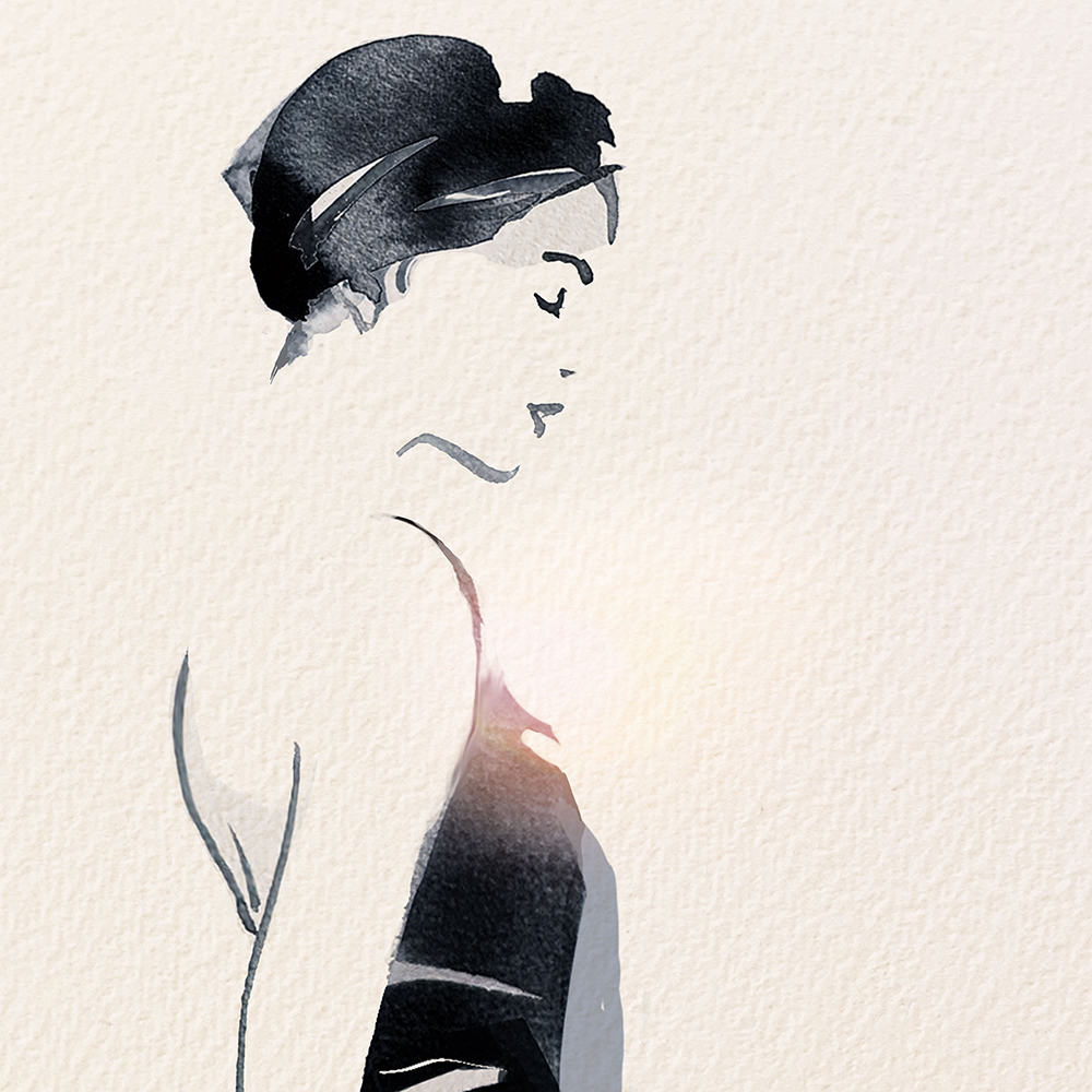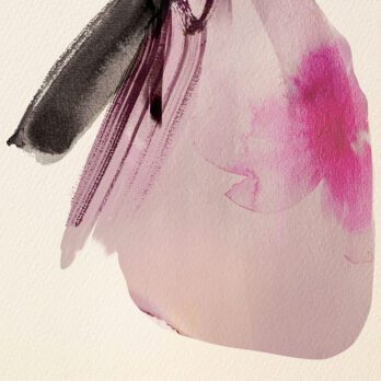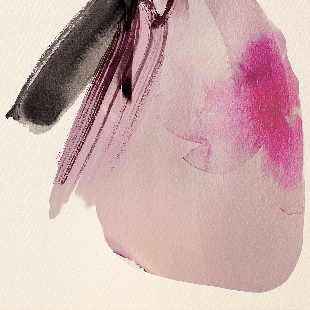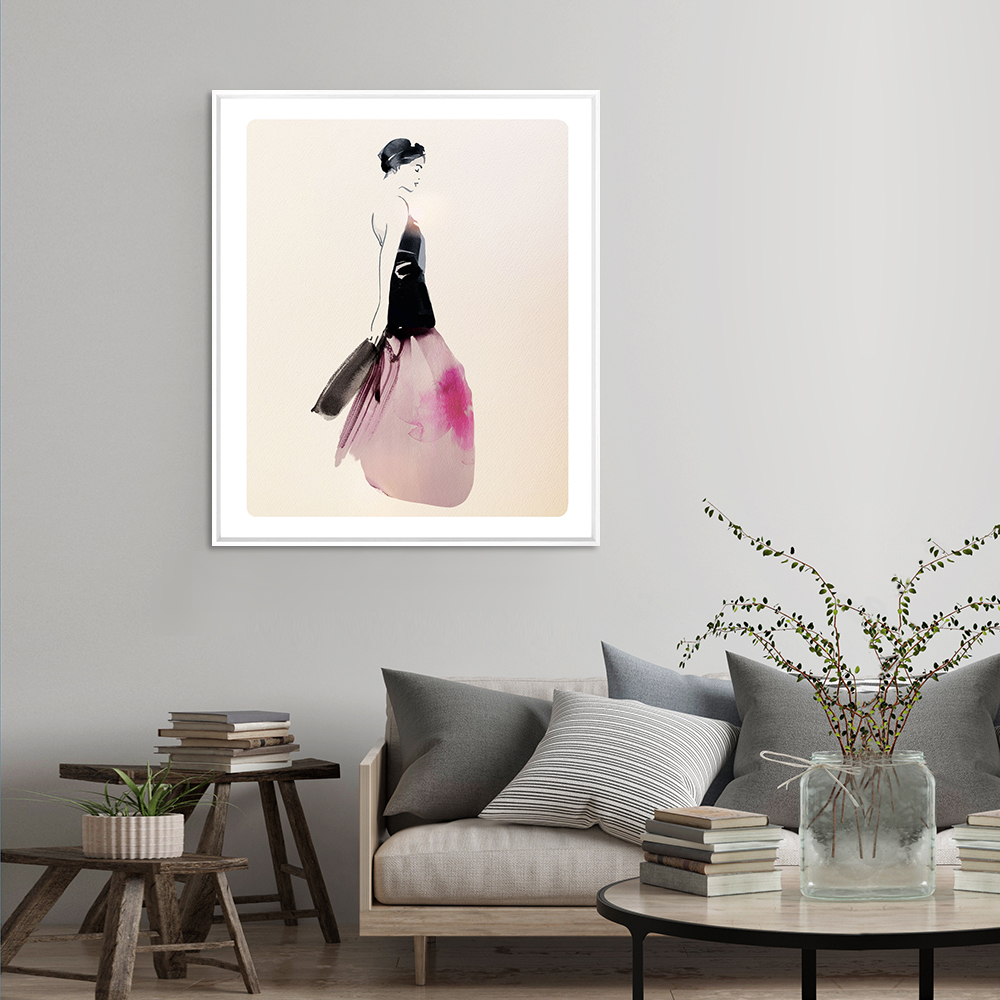 Cette œuvre de Sophie Griotto illustre une femme en robe vaporeuse, mêlant contraste noir et rose aquarellé dans un style minimaliste. Une composition élégante et contemporaine qui capte à la fois mouvement et sérénité.