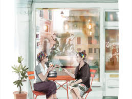 Ses œuvres, souvent inspirées par ses voyages et son environnement urbain, captivent par leur capacité à raconter en une seule image. Elles sont construites autour d’un concept simple : dans tout paysage se cachent des histoires et celles-ci ne demandent qu’à accrocher, intriguer le spectateur. Avec un traitement graphique rappelant la ligne claire et une énergie vibrante, chaque scène invite le spectateur à s’immerger dans un univers narratif unique et un style définitivement contemporain. Que ce soit une bulle échappant d’une fenêtre ou des personnages intrigants dans un paysage urbain, chaque détail invite à l’imagination. Intrigante ou drôle, inquiétante, loufoque ou romantique cette histoire appartient à chacun.