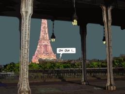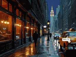 Ses œuvres, souvent inspirées par ses voyages et son environnement urbain, captivent par leur capacité à raconter en une seule image. Elles sont construites autour d’un concept simple : dans tout paysage se cachent des histoires et celles-ci ne demandent qu’à accrocher, intriguer le spectateur. Avec un traitement graphique rappelant la ligne claire et une énergie vibrante, chaque scène invite le spectateur à s’immerger dans un univers narratif unique et un style définitivement contemporain. Que ce soit une bulle échappant d’une fenêtre ou des personnages intrigants dans un paysage urbain, chaque détail invite à l’imagination. Intrigante ou drôle, inquiétante, loufoque ou romantique cette histoire appartient à chacun.